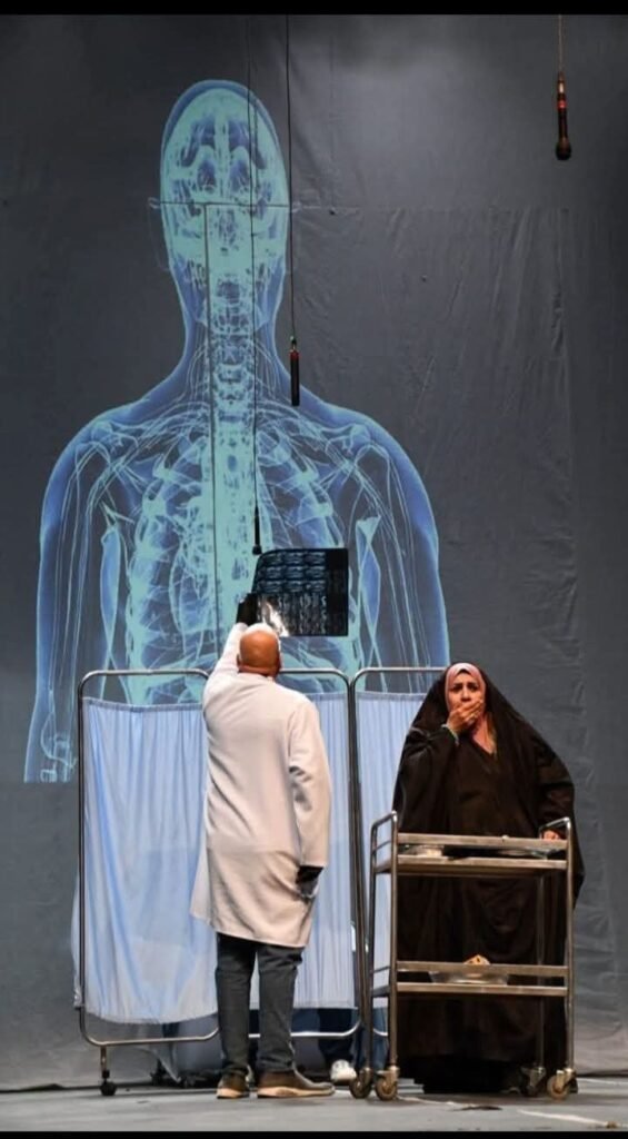فما كان من المعالجة الاخراجية( لاسامه السلطان) الا ان تمسك بحبل الحكايه وابقى عليها ، محافظة على وتائرها خصوصا بعد ان البسها لبوسها الواقعي سينوغرافياً، حيث المشهد هو ردهه بسرير وادوات واكسسوارات واقعية وبعض من الصور الخلفية في اشارات الى حياه- وموت ولو في طبقة تأويلية قريبة من طبقات الابعاد التأويلية للعرض ،لذا فقد حاول المخرج اسامه ان يضفي على هذه التقليدية بعضا من اللمسات للخروج بالصورة البصرية الى منطقة الاسئله.. المكان. الزمان. الساعات المتحركه حركه الزمن .الجسد، تشريح الجسم.. وهكذا ظل العرض يراوح بين المضمر والمعلن ويرسم ملامح فلسفة الوجود والامل الذي انتهى اليه العرض بوصفه رسالة ايجابيه تشيع الامل في حياة جديدة..