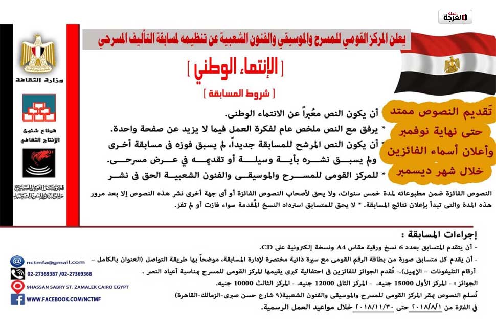يستقبل المركز القومي للمسرح والموسيقى والفنون الشعبية يوميا المتقدمين لمسابقة التأليف المسرحي “الإنتماء الوطني” بعد مد فترة التقدم حتى 30نوفمبر2018 وذلك بمقر المركز الكائن ب9ش حسن صبرى بالزمالك.