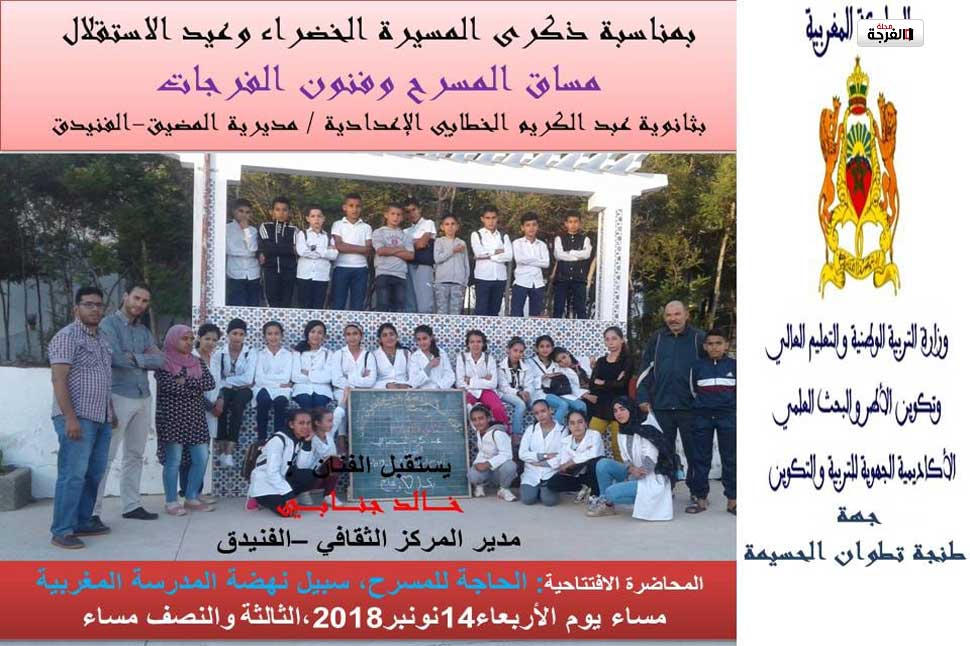 احتفالا بذكرى عيد المسيرة الخضراء و عيد الاستقلال، يفتتح مساق المسرح وفنون الفرجات بثانوية عبد الكريم الخطابي مديرية المضيق الفنيدق، أنشطته برسم الموسم الدراسي2018/2019 بمحاضرة افتتاحية بعنوان: “الحاجة للمسرح،سبيل نهضة المدرسة المغربية”.