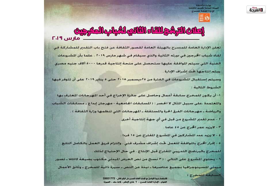 أعلنت الإدارة العامة للمسرح بهيئة قصور الثقافة عن شروط ومواعيد المشاركة بالدورة الثانية للقاء شباب المخرجين، والذى يقام في مارس 2019 .