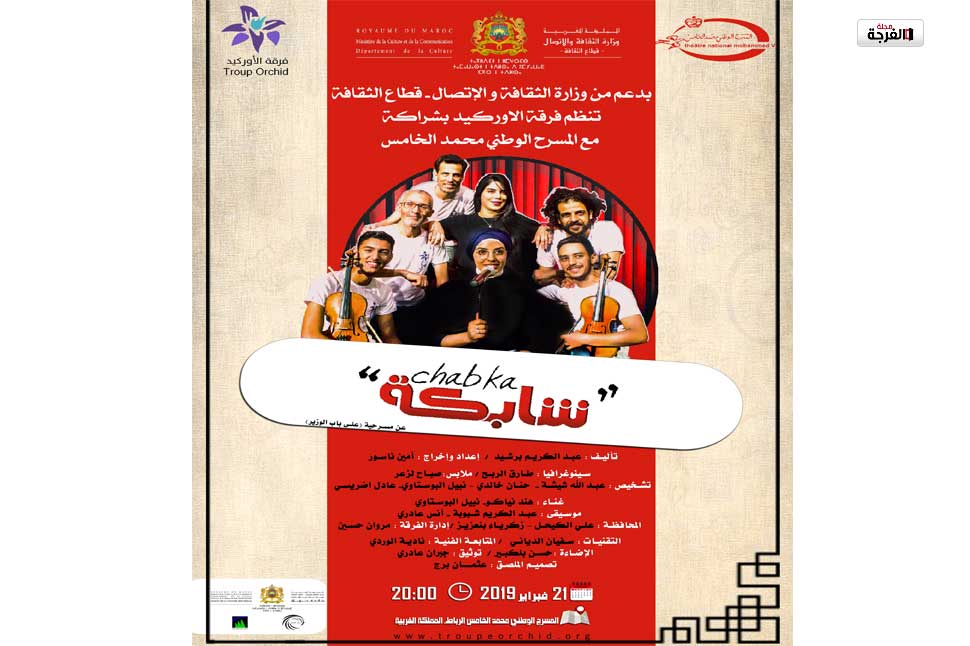 بدعم من وزارة الثقافة وبشراكة مع المسرح الوطني محمد الخامس تقدم فرقة الأوركيد يوم الخميس 21 فبراير 2019 على الساعة الثامنة مساء بالمسرح الوطني محمد الخامس بالرباط عملها المسرحي “شابكة”.