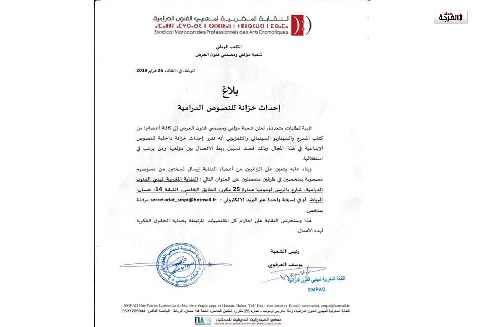 تلبية لطلبات متعددة، تعلن شعبة مؤلفي ومصممي فنون العرض إلى كافة أعضائها من كتاب المسرح والسيناريو السينمائي والتلفزيوني أنه تقرر إحداث خزانة داخلية للنصوص الإبداعية في هذا المجال وذلك قصد تسهيل ربط الاتصال بين مؤلفيها ومن يرغب في استغلالها.