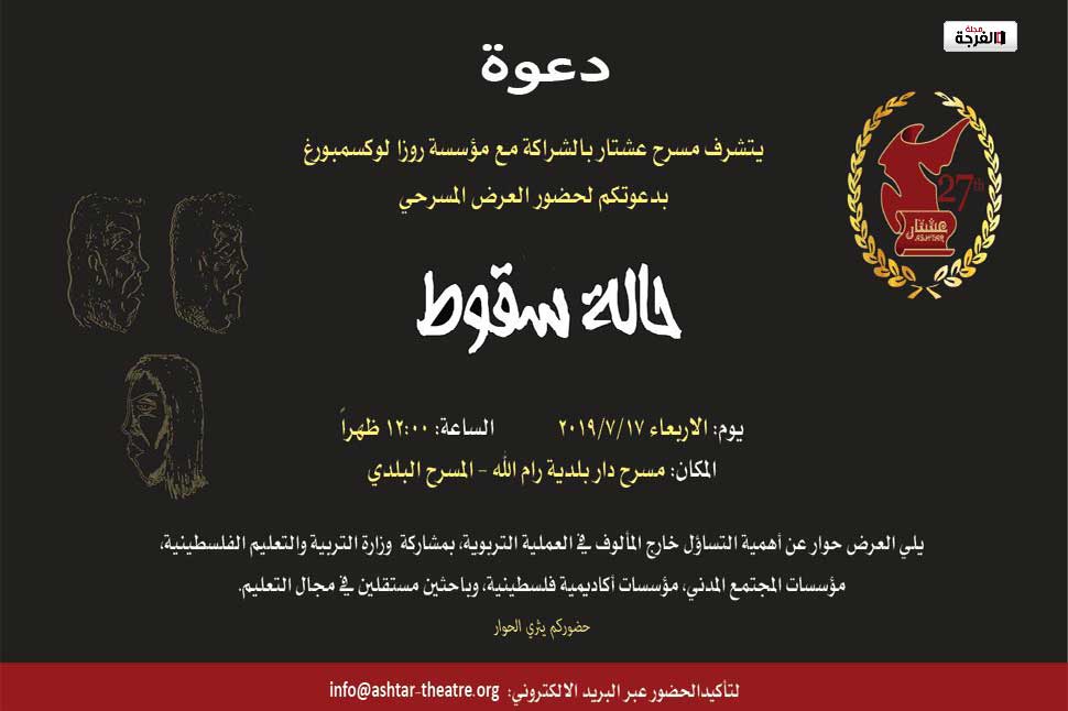 يسر مسرح عشتار دعوتكم لحضور العرض المسرحي الخاص “حالة سقوط”، والذي سيفتح النقاش مع التربية والتعليم والمجتمع المدني حول التعليم في فلسطين بين جدلية العلم والدين في مناهجنا الفلسطينية.