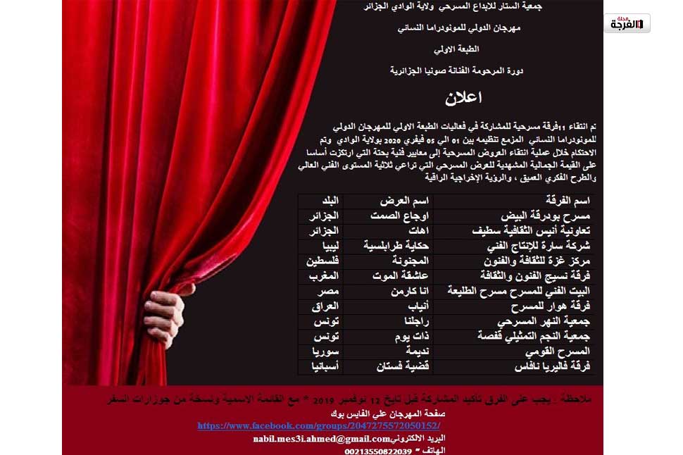 تم انتقاء 11 فرقة مسرحية للمشاركة في فعاليات الطبعة الاولي للمهرجان الدولي للمونودراما النسائي المزمع تنظيمه بين 01 الي 05 فيفري 2020 بولاية الوادي وتم الاحتكام خلال عملية انتقاء العروض المسرحية إلى معايير فنية بحتة التي ارتكزت أساسا على القيمة الجمالية المشهدية للعرض المسرحي التي تراعي ثلاثية المستوى الفني العالي والطرح الفكري العميق ، والرؤية الإخراجية الراقية: