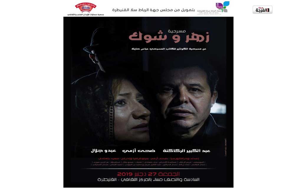 بتمويل من جهة الرباط سلا القنيطرة، تقدم فرقة مسارات للإبداع الثقافي والفني مساء الغد الجمعة 27 ديسمبر الجاري على الساعة (السادسة والنصف) بالمركز الثقافي بالقنيطرة مسرحيتها الناجحة “زهر وشوك “عن مسرحية ” الكونتنير” للكاتب المسرحي والناقد عباس الحايك تشخيص الفنان المقتدر عبد الكبير الركاكنة ، الفنانة ضحى ازمي والفنان عبدو جلال سينوغرافيا واخراج ، الفنان سعيد بهادي مساعدة الاخراج ،ندى .