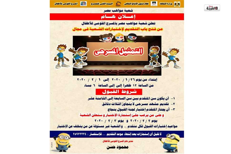 قال الفنان وائل ابراهيم المشرف على شعبة “مواهب مصر” بفرقة المسرح القومي للأطفال بالبيت الفني للمسرح، ان الشعبة فتحت باب التقدم للأطفال للانضمام الى ورشة التمثيل للأطفال و ذلك ابتداء من اليوم الأحد الموافق 26 يناير و حتى يوم السبت المقبل الموافق 1 فبراير القادم، وذلك عن طريق ملء استمارة المشاركة المتاحة بمسرح متروبول بالعتبة .