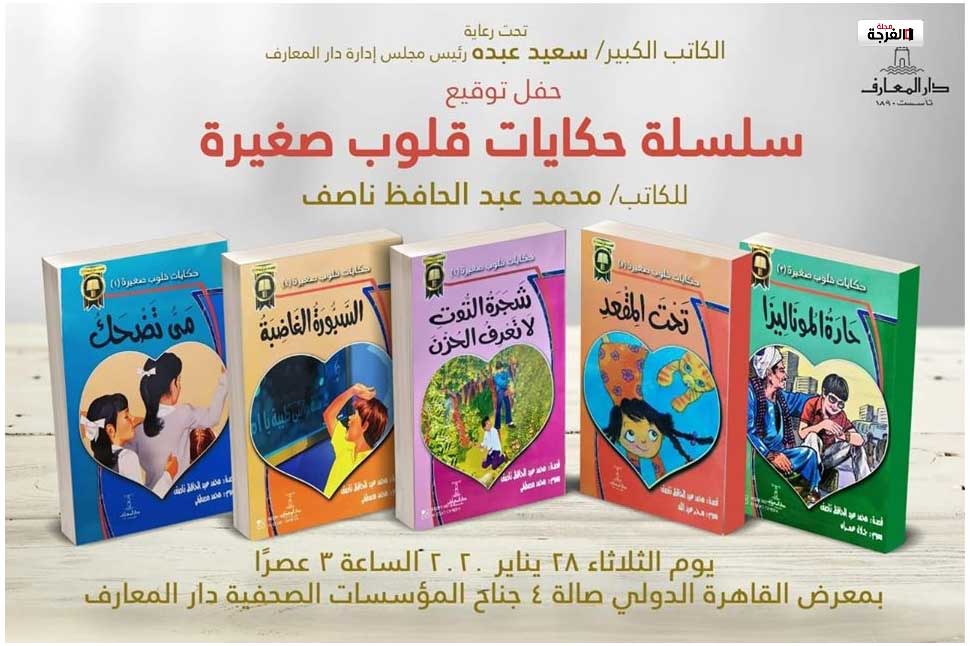 بمناسبة معرض القاهرة الدولى للكتاب فى دورته 51، صدر للكاتب محمد عبد الحافظ ناصف سلسلة “حكايات قلوب صغيرة” من 8-12 عاما، عن مؤسسة دار المعارف برئاسة الكاتب سعيد عبده ،وهى سلسلة  قصصية تتكون من خمسة كتب و هى؛ قصة “مى تضحك”  رسوم الفنان محمد مصطفى، قصة “شجرة التوت لاتعرف الحزن” رسوم محمد مصطفى،قصة “حارة الموناليزا”  رسوم الفنان الكبير جلال عمران، قصة “السبورة الغاضبة”رسوم محمد مصطفى،قصة “تحت المقعد” رسوم  الفنانة سحر عبد الله، وهى حكايات لقلوب صغيرة لها قلوب كبيرة، و نفوس مستقيمة، و أرواح محلقة فى سماء العمل و الجد و الإجتهاد، تسعى دائما نحو الحب و الخير و الجمال فى مجتمعنا العربى،و ذلك من خلال مواقف حياتية صعبة تقابلها ربما كل يوم فى واقعنا الذى نعيشة، الملآن أحيانا بالمشكلات و الأزمات و العقبات التى تواجهها فى البيت و الشارع و الفصل و المدرسة لكنها تستطيع أن تقاوم هذا الواقع و تنتصر عليه فى النهاية،وتسعى كى تجعله أكثر جمالا و عدالا لأنها تمتلك  فى النهاية قلوبا بيضاء صغيرة قادرة على التغيير.