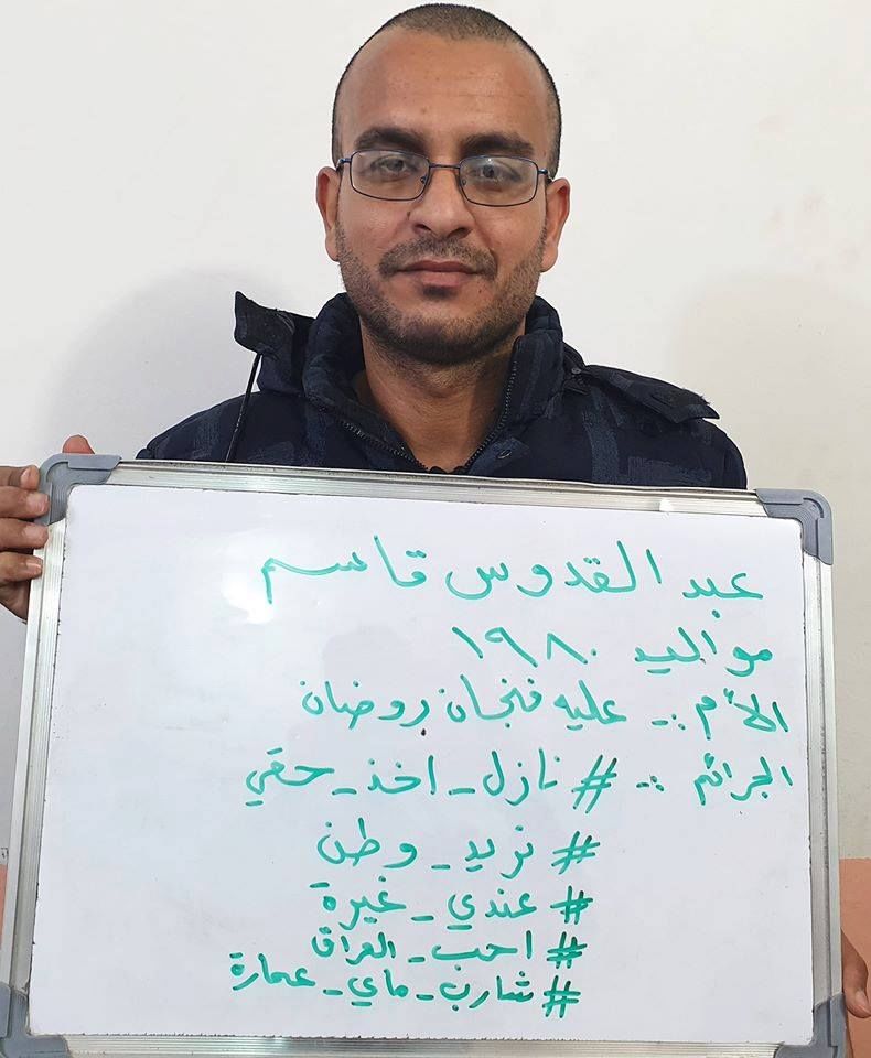 الشهيد الفنان عبد القدوس قاسم من مواليد العمارة 1980 خريج المعهد التقني في ميسان،وهو أب ل3 أطفال (ولدان وبنت)،من سكنةمنطقة (الجديدة) وسط مدينة العمارة، ويعمل موظفا في اعلام السجن المركزي بالمحافظة”.