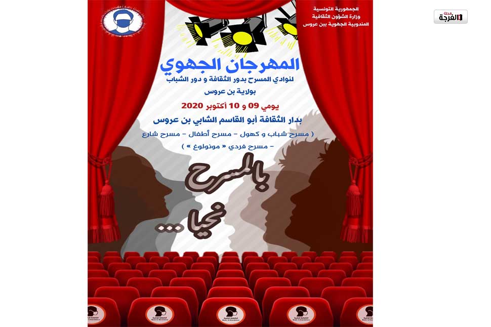 تنظم المندوبية الجهوية للشؤون الثقافية ببن عروس بالتعاون مع دار الثقافة أبي القاسم الشابي ببن عروس، المهرجان الجهوي للمسرح بدور الثقافة ودور الشباب بولاية بن عروس وذلك يومي الجمعة 9 والسبت 10 أكتوبر 2020 بدار الثقافة أبي القاسم الشابي ببن عروس.