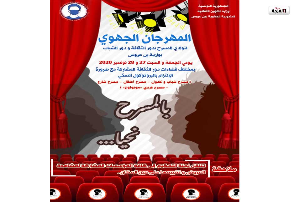 تنظم المندوبية الجهوية للشؤون الثقافية ببن عروس المهرجان الجهوي للمسرح بدور الثقافة ودور الشباب بولاية بن عروس وذلك يومي الجمعة 27 والسبت 28 نوفمبر2020 بمختلف مقرات الدور المشاركة.