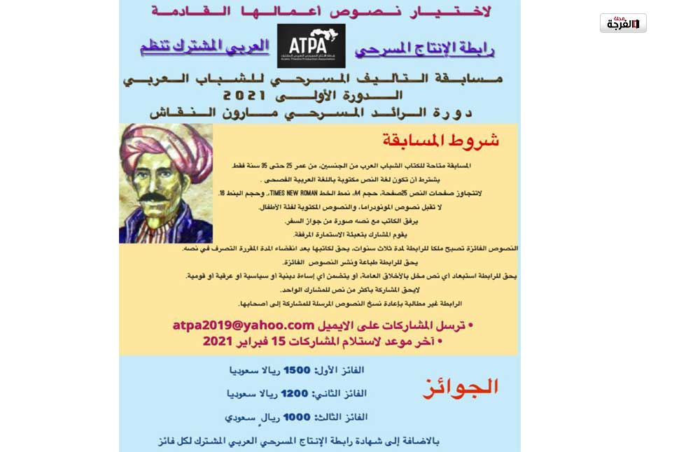 مع انطلاق عام 2021 تنظم رابطة الإنتاج المسرحي المشترك ATPA للشباب العربي مسابقة التأليف المسرحي 2021 في دورتها الأولى .. دورة الرائد المسرحي مارون النقاش وقد رصدت الرابطة جوائز قيمة للمسابقة، وقد أشار مؤسس ورئيس الرابطة الدكتور سامي الجمعان من المملكة العربية السعودية إلى أن الرابطة تعنل من أجل شراكة مسرحية عربية مستدامة ، وهدفها من اطلاق المسابقة عدم احتمار النصوص على كتاب بعينهم بل فتح المجال لكل عربي لتقديم مالديه، وفق ماتنص عليه شروط المسابقة ، وهي: