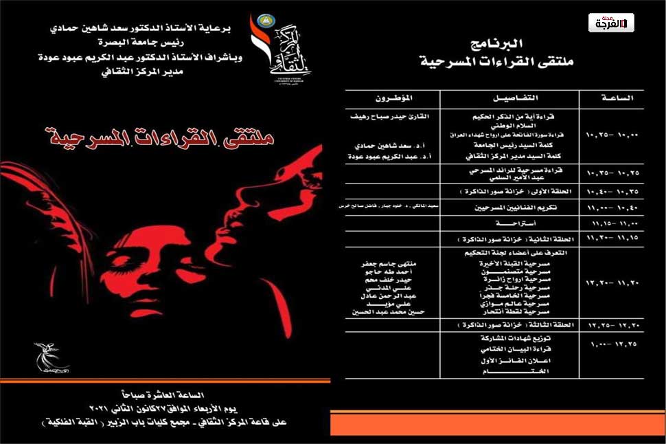 نظم المركز الثقافي في جامعة البصرة ملتقى القراءات المسرحية برعاية الاستاذ الدكتور سعد شاهين حمادي رئيس جامعة البصرة وباشراف الاستاذ الدكتور عبدالكريم عبود عودة مدير المركز وعلى قاعة المركز الثقافي القبة الفلكية وبحضور نقيب الفنانيين العراقيين فرع البصرة السيد فتحي شداد ومجموعة من اكاديميين ومثقفين ومسرحين معنين بالثقافة والمسرح .