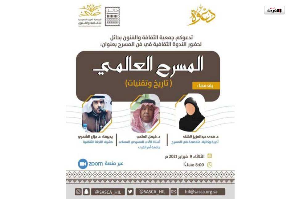 نظمت جمعية الثقافة والفنون بحائل أمس, ندوة ثقافية (عن بعد) حول فنّ المسرح بعنوان (المسرح العالمي، تاريخ وتقنيات) تناولت عدة محاور عن تاريخ المسرح العالمي ونشأته عند اليونانيين والرومان، إضافة لآليات وتقنيات المسرح العالمي والعربي والسعودي.