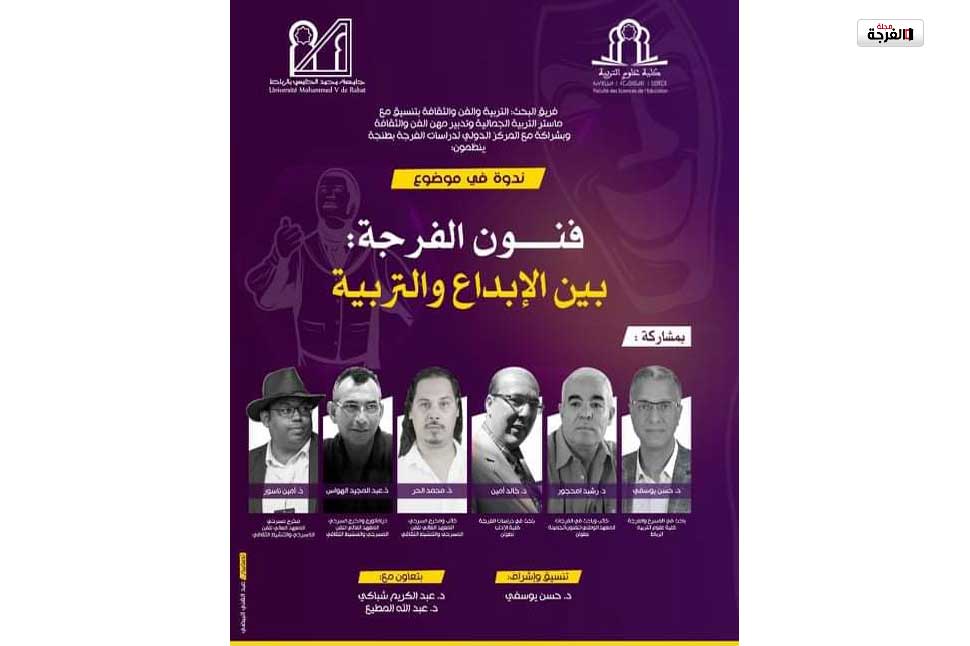 ينظم فريق البحث التربية والفن والثقافة التابع لكلية علوم التربية ـ جامعة محمد الخامس الرباط بتنسيق مع ماستر التربية الجمالية وتدبير مهن الفن و الثقافة و بشراكة مع المركز الدولي لدرسات الفرجة بطنجة، يوم السبت 22 مايو الجاري بقاعة الندوات، ندوة فنية ثقافية تحت عنوان: “فنون الفرجة: بين الإبداع و التربية” من تأطير ثلة من الدكاترة و الفنانين، سيتناولون الموضوع من مختلف الزوايا التي ترتكن عن تجارب و خبرات و تراكم فني سواء من خلال الممارسة و التأطير و التنظير.