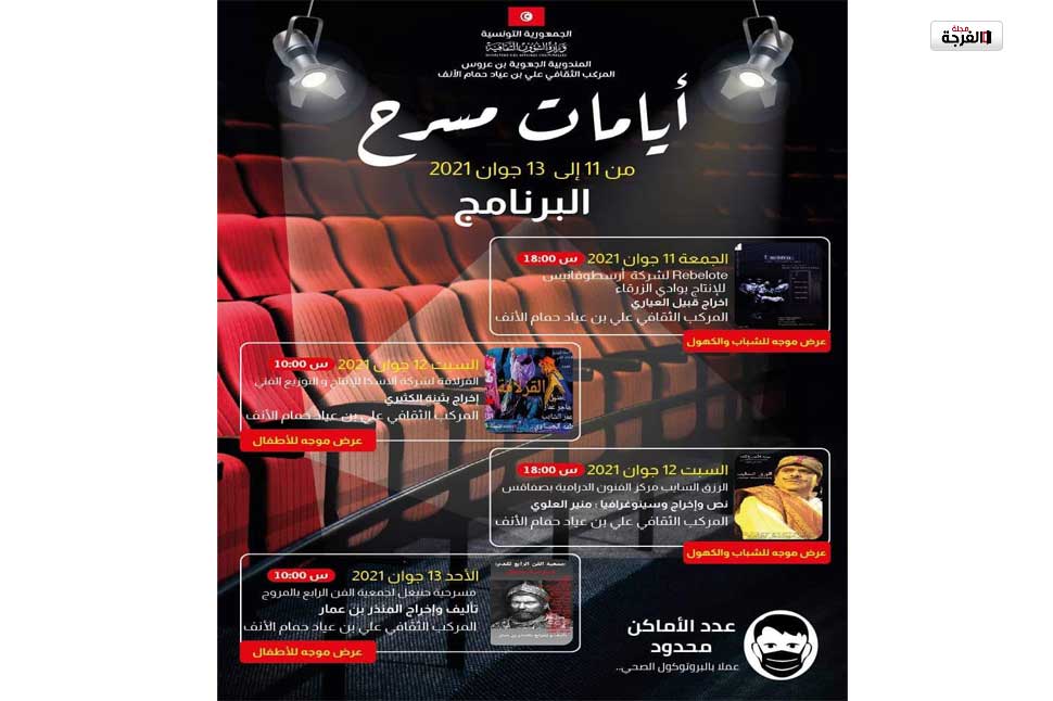 ينظم المركّب الثقافي علي بن عياد بحمام الأنف تحت إشراف المندوبية الجهوية للشؤون الثقافية ببن عروس الدورة الأولى لتظاهرة أيامات مسرح وذلك من 11 إلى 13 يونيو 2021 بالمركب المركب الثقافي علي بن عياد بحمام الأنف.تشتمل على عروض مسرحية لمختلف الاعمار وفقا للبرنامج التالي: