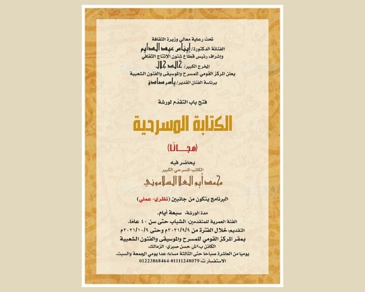 يعلن المركز القومي للمسرح والموسيقي والفنون الشعبية برئاسة الفنان القدير ياسر صادق. عن فتح باب التقدم لورشة(الكتابة المسرحية) (مجانا) يحاضر فيه الكاتب المسرحي الكبير (محمد أبو العلا السلاموني) البرنامج يتكون من جانبين (نظري- علمي) تهدف هذه الورشة إلى تأهيل مؤلفين جدد علي درجة عالية من حرفية فن الكتابة المسرحية مما ينعكس علي الحركة المسرحية بأكملها.