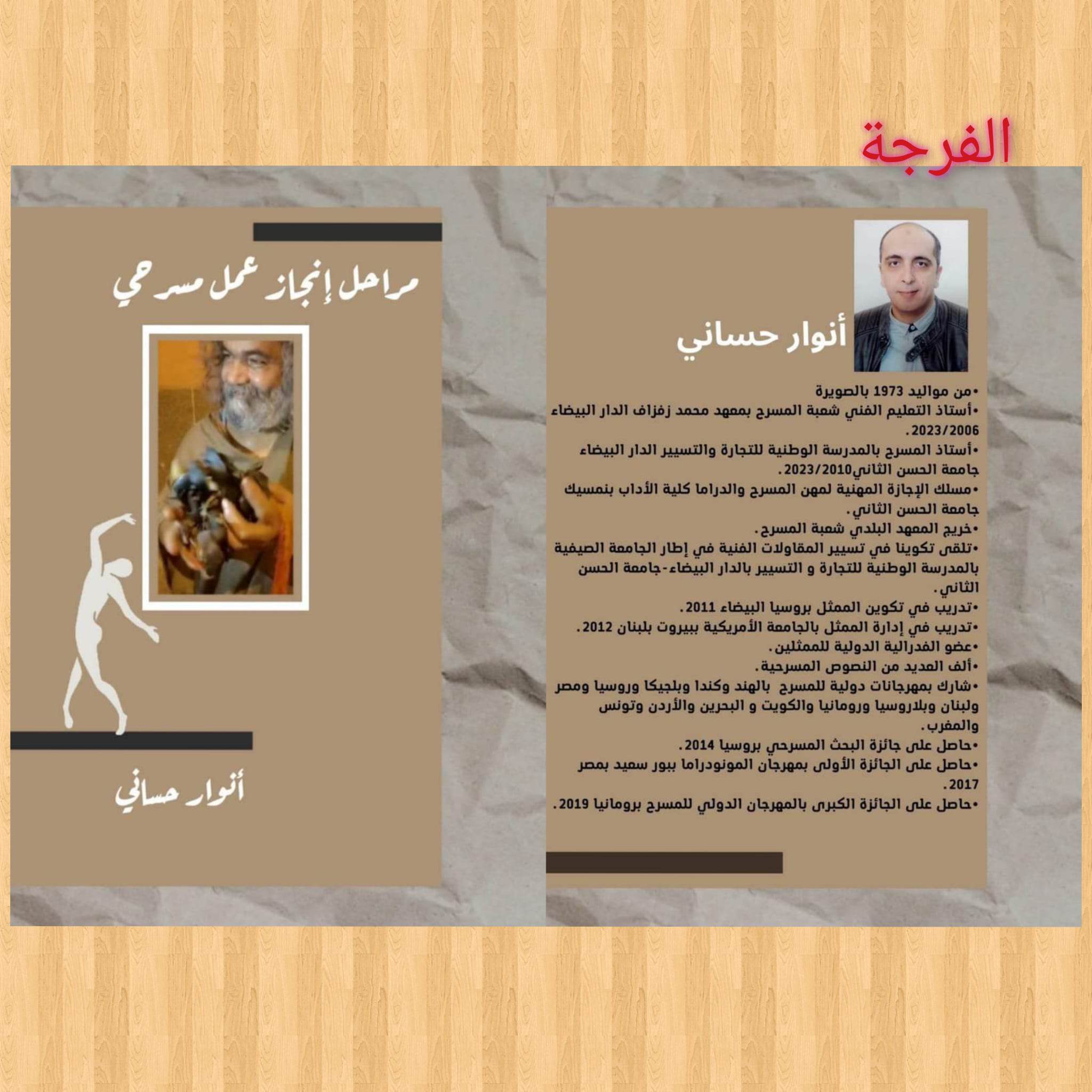 بعد كتاب مسرحية ” الماضي فات “، وعن مطبعة بلال 2023 وبحجم متوسط (100 صفحة)، يصدر الكاتب والمخرج المسرحي المغربي (أنوار حساني) كتابه الثاني بعنوان: “مراحل إنجاز عمل مسرحي”. والذي يحتوي على ست مراحل: