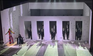 المغنية الصلعاء في أوبرا العزاوي التي تجسدها الممثلة نعمت على تلك الخشبة لتكون هي قائد العرض، يستدعي العزاوي في هذه الشخصية ملامح الحكواتي عند بريشت لتكون الممثلة بين اللعب الأدائي و الحدث المقدم، هنا نجد أن مخرج العمل يسير من القصة المحلية صوب العرض العالمي.